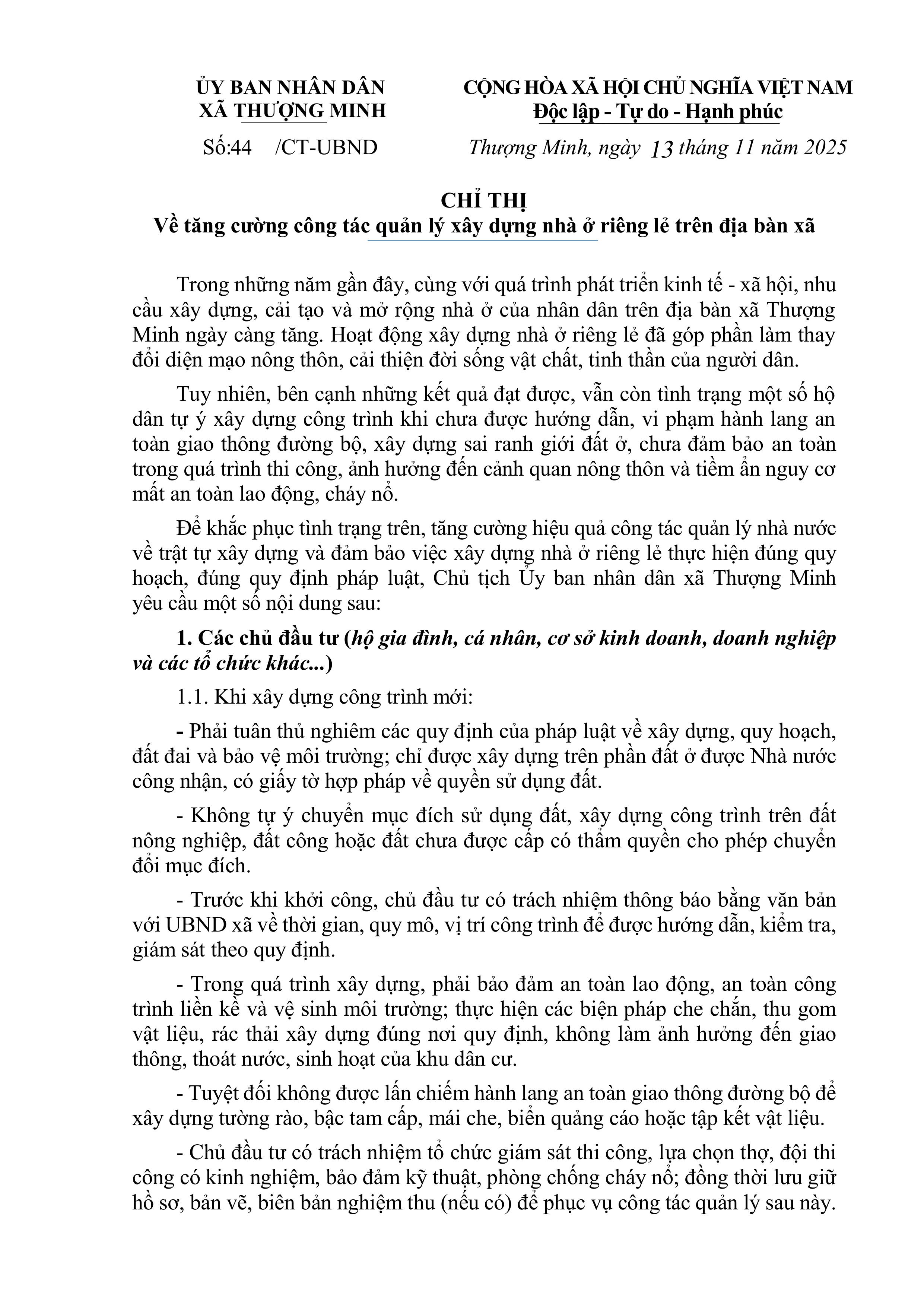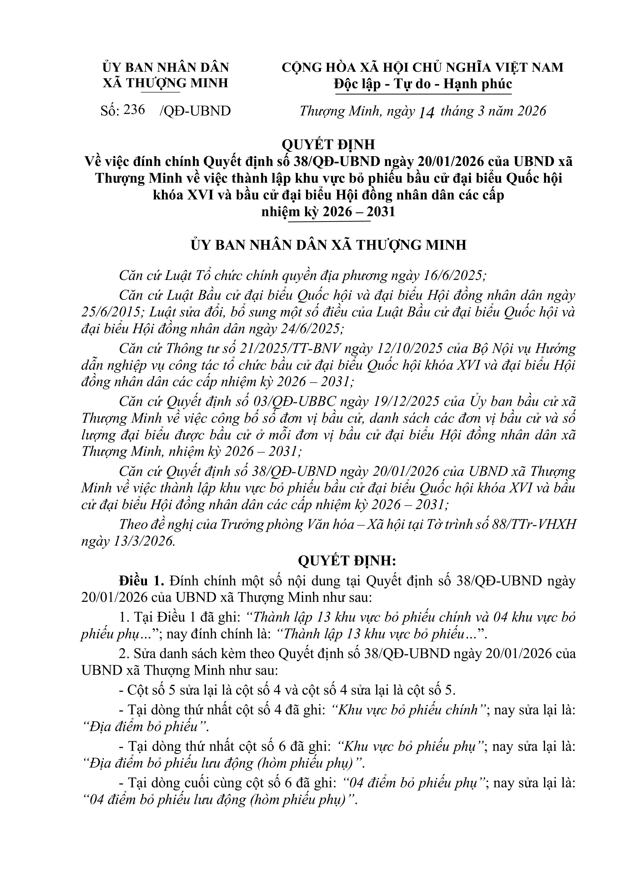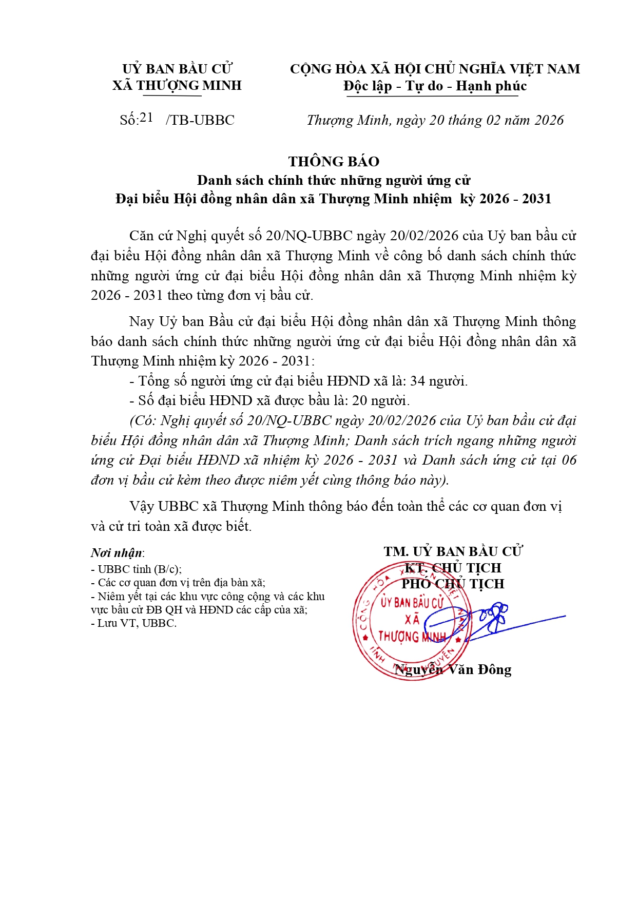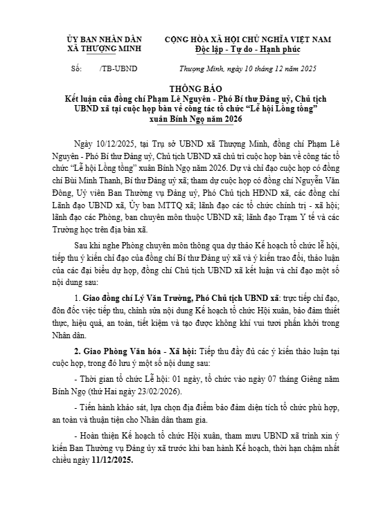Ủy ban nhân dân xã Thượng Minh thông báo: