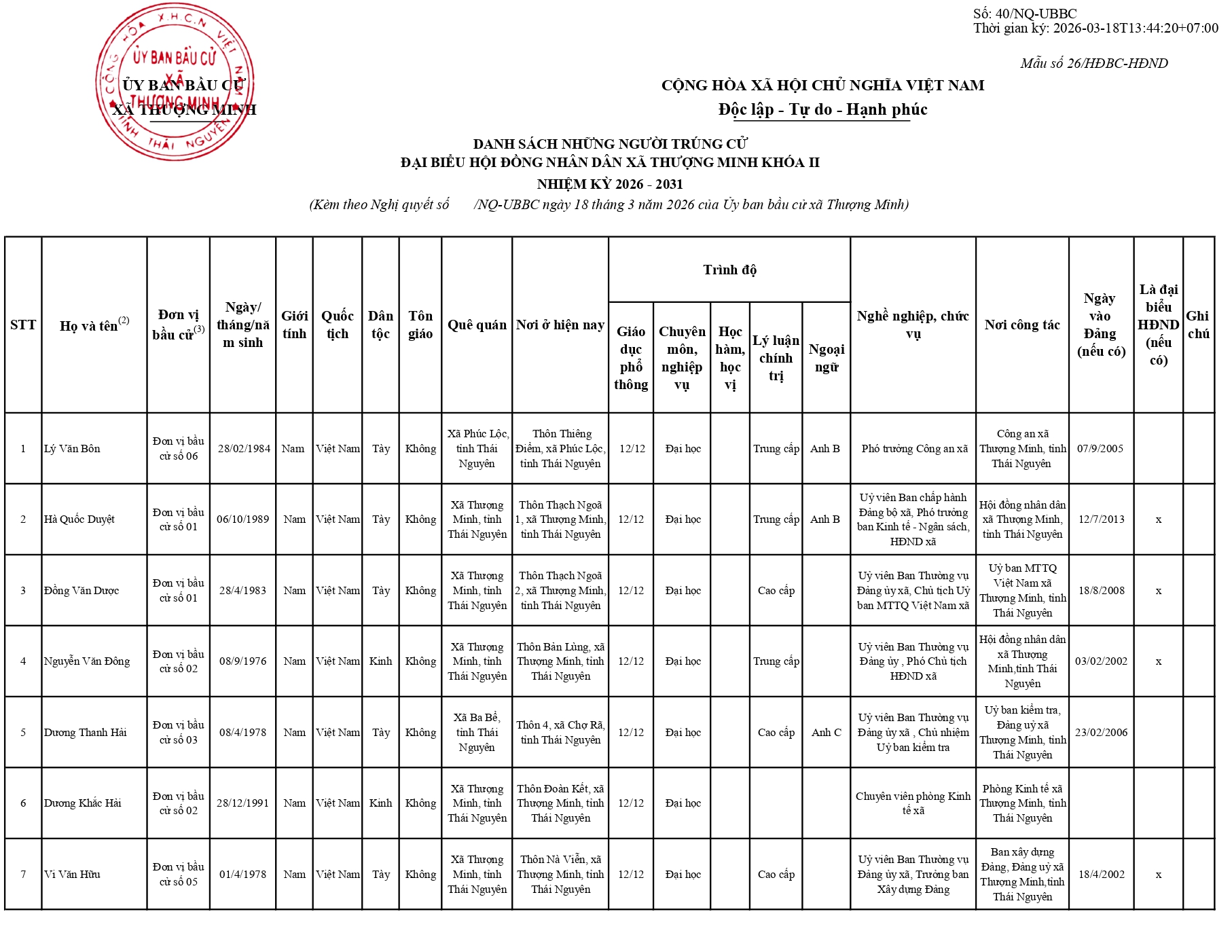NGHỊ QUYẾT CÔNG BÔ KẾT QUẢ BẦU CỬ VÀ DANH SÁCH NHỮNG NGƯỜI TRÚNG CỬ ĐẠI BIỂU HĐND XÃ THƯỢNG MINH